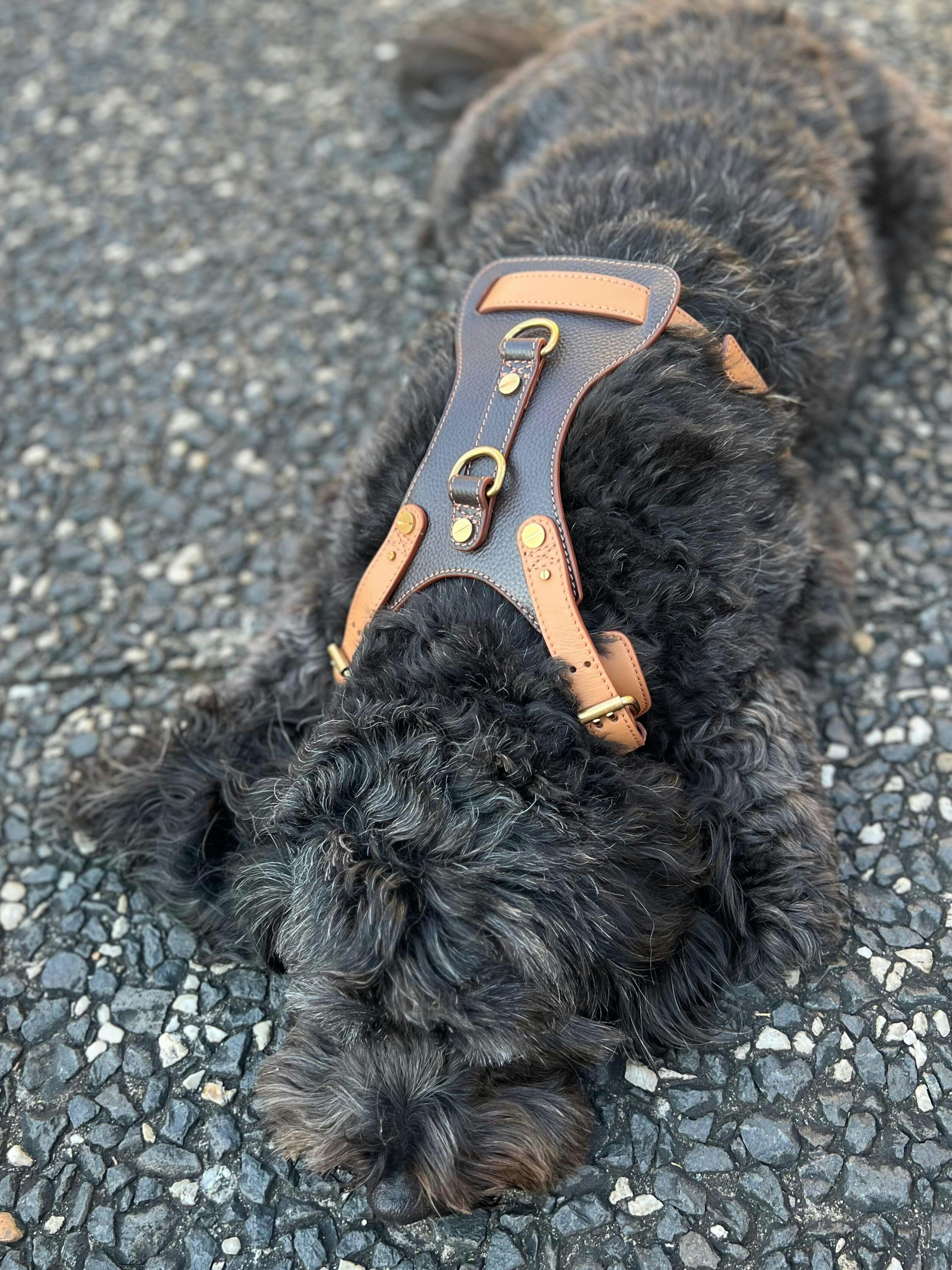 Crafted from smooth A-grade (lamb) nappa leather in Chai, accented with bitter chocolate pebble leather and contrast edging. Custom brass hardware with contrast stitching. Complete the look with matching Lead, Utility Sac, and Ball Pouch. Easy to fit with adjustable straps and front and back attachments for lead walk training.
