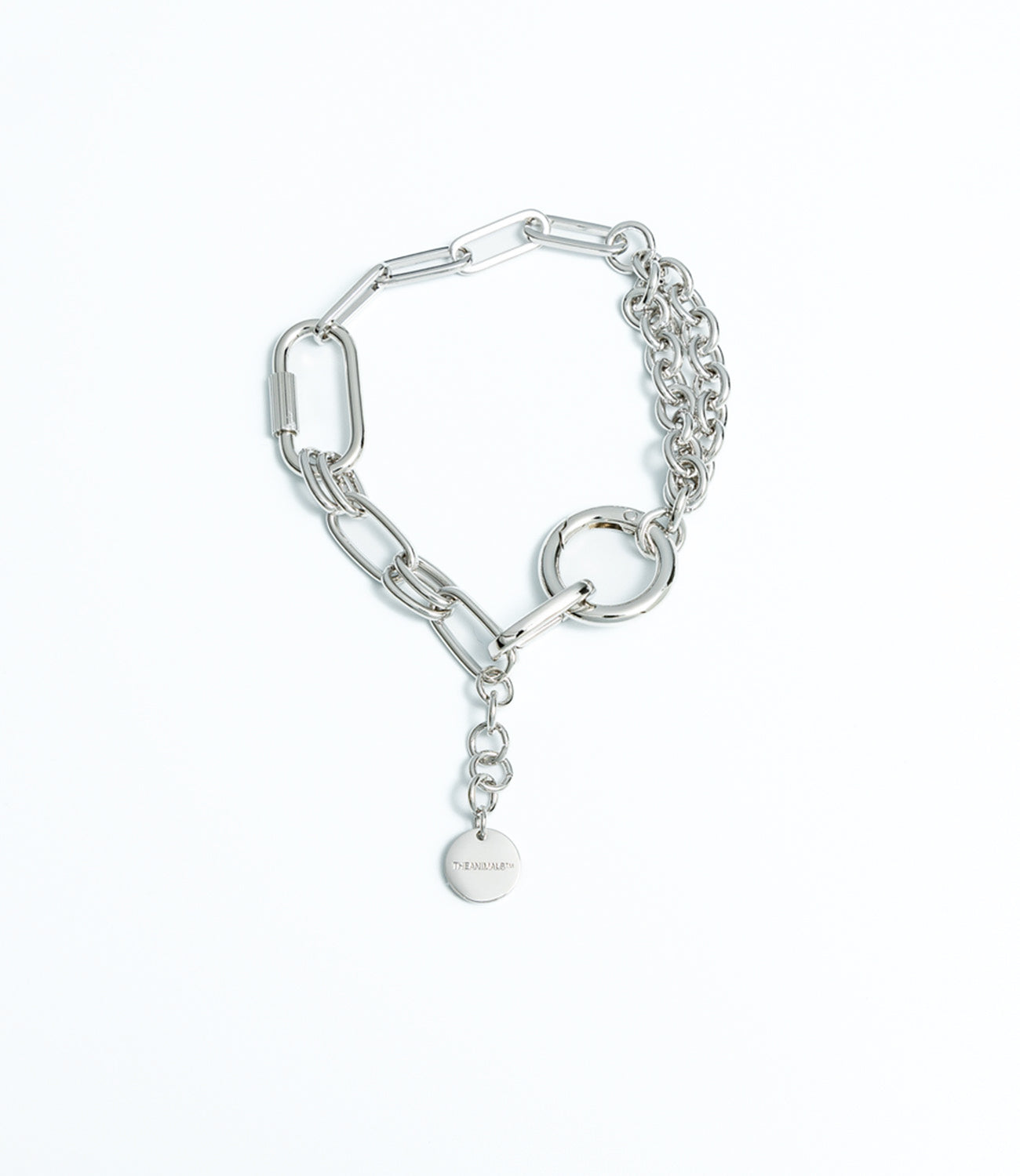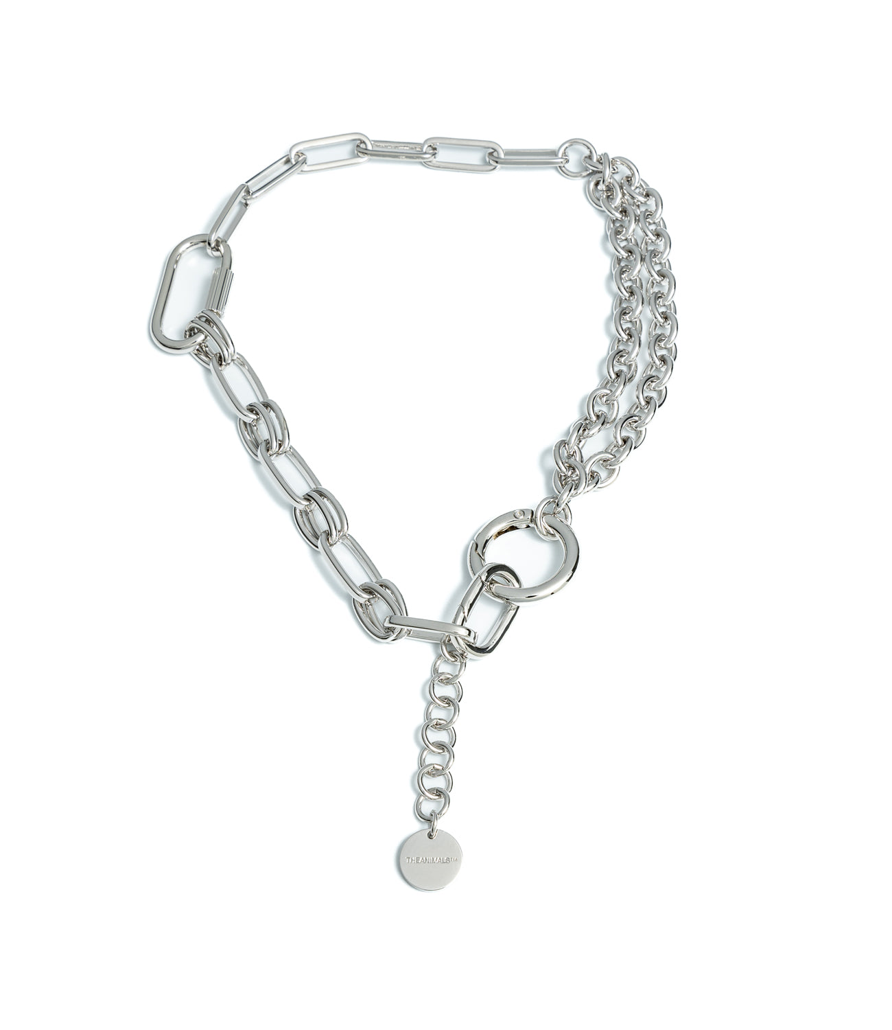 THEANIMALS™ species-fluid Multi Chain Necklace. Available in both 18ct Gold-plated brass and Rhodium. Features interlocking chain links, spring ring and screw closure. Includes extension chain and custom small logo disc. Attach any Charmes from our range. Packaged with branded dust bag and box.