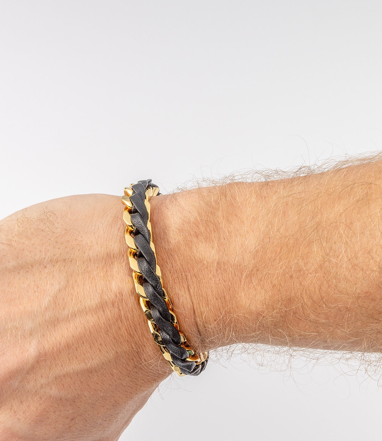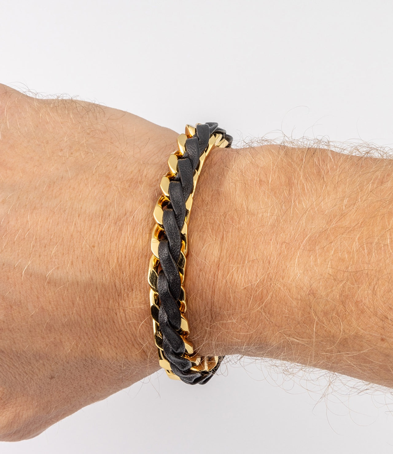 THEANIMALS™ Leather Braid Bold Bracelet. Available in both 18ct Gold-plated brass and Rhodium with 100% lambskin leather. Features interlocking chain links, ultra soft leather braid and signature engraved lobster clasp. Packaged with branded dust bag and box.